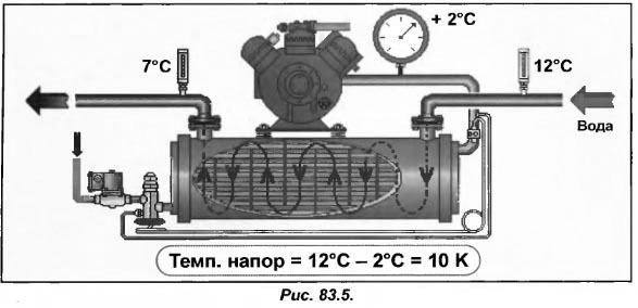 Если при работе с воздухоохладителями непосредственного охлаждения используется «правило 10 К», то для испарителей, применяемых для охлаждения воды, действует «правило 5 К». Представим, что нам необходимо снизить температуру воды с 12 С до 7 С. Согласно «правилу 5 К» получится: - температура воды на выходе и входе в испаритель будет равна за исключением 5 К (12 С — 5 К=7 С);