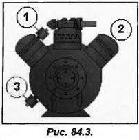 Для более мощных компрессоров применяют другие методы регулирования производительности. Так для управления механическими устройствами, служащими для отжима всасывающих клапанов, применяется давление масла. Под действием данного давления всасывающие клапаны остаются постоянно открытыми и соответствующие цилиндры не принимают участие в работе компрессора. При этом на картере компрессора может быть установлено 3 или 4 электроклапана (поз.3 рис.84.3).