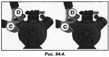 Во всех компрессорах, оснащенных системой регулирования производительности, легко определить работающие цилиндры. Для этого необходимо их просто ощупать, так, если головка в точке С чуть теплая, а в точке D горячая (рис.84.4), то это означает, что данная группа работает нормально. Холодный пар хладагента проходит через расположенный под цилиндрами картер и выходит горячим под высоким давлением из верхней точки цилиндра. Из нее он поступает к центральной головке блока и выходит через нагнетательный вентиль.