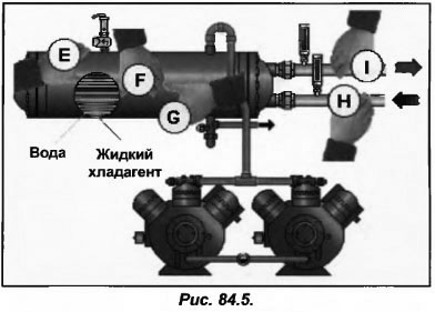С целью оптимизации переохлаждение, холодная вода поступает в конденсатор снизу. Обладая определенными навыками, можно оценить высоту жидкого хладагента на дне конденсатора.