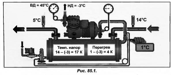 Что сделал ремонтник? Он измерил температуру, а после этого запустил компрессор. В результате температура на входе в испаритель снизилась до 14 С, а на выходе до −5 С (рис.85.1).