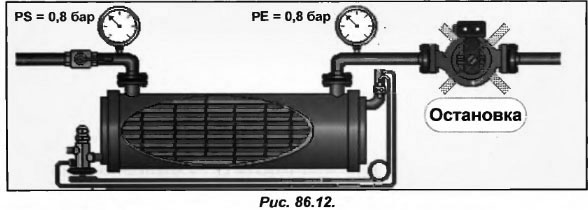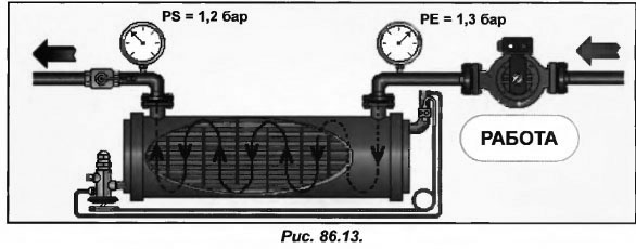 Предположим, при расходе воды 10 м3/ч, показания измерений манометра составили РЕ=1,3 бар и PS=1,2 бар (рис.86.13), тогда разность равна ΔP=0,1 бар или 1 м вод. ст.