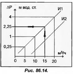Представим, что перед нами стоит задача оценить расход воды через испаритель И1. Показания манометров составляют РЕ=13,45 м вод. ст., а PS=11,2 м вод. ст. Получаем ΔP=2,25 м вод. ст. Теперь согласно графика (рис.86.14) мы видим, что расход воды через испаритель равен 15 м3/ч.