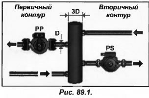 Известно, что кроме обычных гидравлических сетей существуют довольно сложные конструкции. Если не разбираться в тонкостях гидравлики, можно предположить, что для одной сети достаточно применять только один насос. Но данная конструкция будет рациональной, если в установке предусмотрен только один испаритель и, соответственно, одна батарея воздухоохладителя. Что же делать, если имеется потребность в холоде для различных помещений, с условием, что в состав установки входит несколько устройств по производству ледяной воды, которым нужно обеспечивать данной водой несколько не связанных между собой потребителей. В данном случае невозможно применить только один насос, чтобы обеспечить разным количество ледяной воды нескольких потребителей. На самом деле, когда речь идет о нескольких сетях производства или потребления ледяной воды, рациональным становится использование смесительного ресивера. Но для его правильной работы должны соблюдаться определенные требования. В данном разделе будет рассмотрена основная информация о смесительных ресиверах (рис.89.1) и их неисправностях.