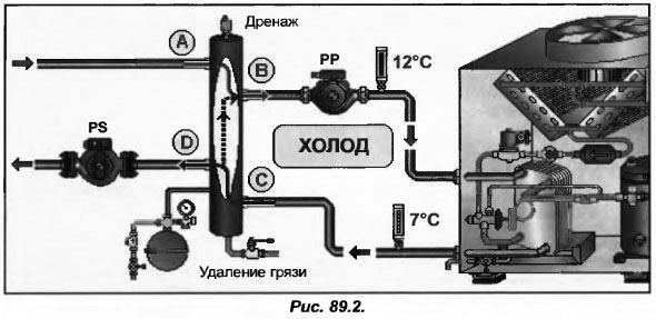 Вначале отметим, что оборотная вода в контуре ледяной воды, поступает из батарей воздухоохладителя. В это же время теплая воды должна направляться в верхнюю часть смесительного ресивера (рис.89.2 поз.А).