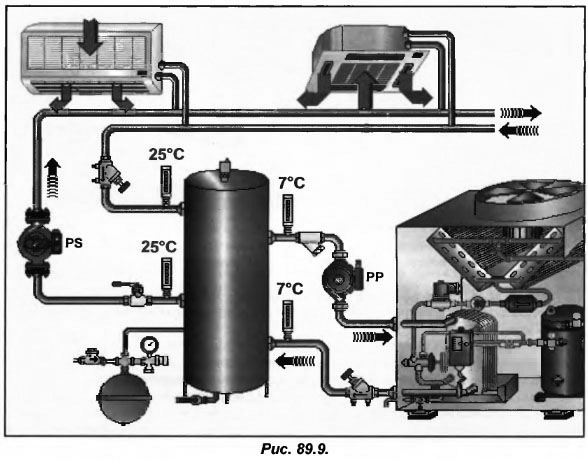 Большие размеры смесительного ресивера Предположим, что прибыв на место для ремонта, мы видим установку, изображенную на рис. 89.9. Компрессор работает редко, в связи с чем чувствуется, что температура в помещениях значительно возросла. На выходе из первичного контура температура воды составляет 7 С (норма), а на входе во вторичные контуры — 25 С. Далее мы замечаем, что размеры и диаметр установленного смесительного ресивера явно больше положенного (параметры определяются по правилу 3D). |