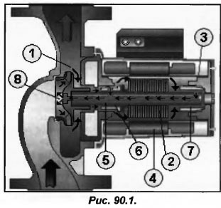 Основное отличие герметичных насосов от остальных заключается в том, что они полностью изолированы от окружающей среды. Такие насосы оснащаются двигателями для охлаждения которых используется вода (даже теплая). На рис.90.1 мы видим, как небольшое количество воды выходит из крыльчатки при давлении нагнетания (поз.1) и циркулирует между ротором двигателя (поз.2) и уплотнительной обоймой (поз.3). Последняя защищает статор (поз.4) от воздействия воды.