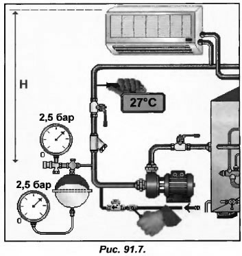 Напомним, что с охлаждением воды ее объем уменьшится, но, несмотря на это, расширительный бачок должен поддерживать давление в контуре на 0,5 бар больше атмосферного. Допустим, температура воды составляет 6 С, тогда давление в бачке должно быть больше высоты столба жидкости Н (рис.91.7) с учетом гарантийного запаса. В нашем примере оно составит Н=5 м вод. ст. + 5 м вод.ст=10 м. вод. ст. или 1 бар.