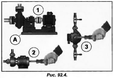 Что касается насоса с сухим ротором (поз.2 рис.92.4), то после снятия напряжения необходимо применить отвертку или другой инструмент для того, чтобы провернуть ось двигателя. Встречаются также и модели с «затопленным» ротором двигателя (поз.3 рис.92.4) в конце вала с завинчивающей пробкой (служащей сливным краном).