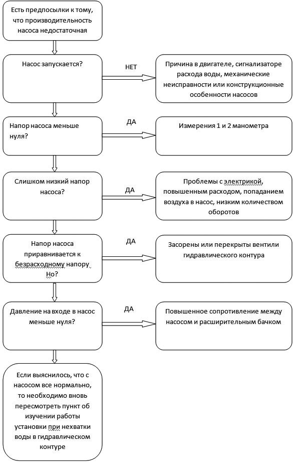 Если вы обнаружили, что неправильная работа установки связана с пониженным расходом воды, необходимо проверить основные параметры установки согласно алгоритму рис.93.4.