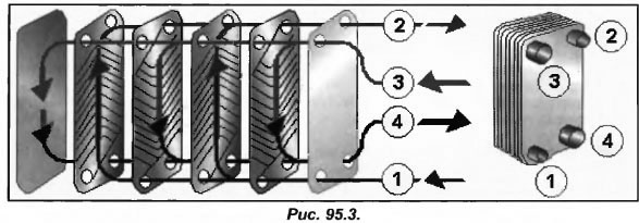 На рис.95.1 мы видим коаксикальный испаритель. В современных установках чаще всего применяют паянные пластинчатые испарители, которые обладают лучшими теплообменными характеристиками, меньшими размерами, но являются более чувствительными к замерзанию воды и к снижению или прекращению расхода воды.