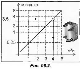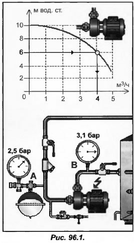Теперь попробуем реализовать все три способа. Если при нулевом расходе напор менее 10 м вод. ст. (рис.96.1), то это означает, что манометры установлены неверно или напорная характеристика не соответствует насосу. Открываем все вентили контура и измеряем напор насоса Н. В нашем примере Н=3,1-2,5=0,6 бар. При этом расход составит 4 м3/ч.
