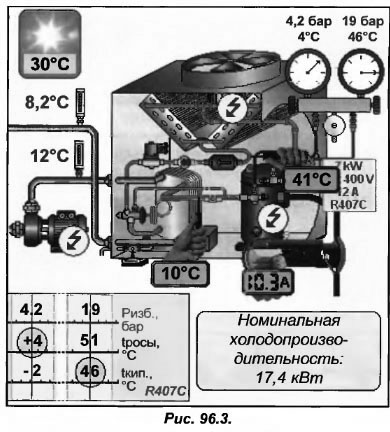 Измеряем перепад температур на испарителе (рис.96.3), который оказывается равен 3.8К, при том что номинальный перепад составляет 5 К. Поскольку замеренная величина оказалась меньше, это говорит о недостатке холодопроизводительности или о повышенном расходе воды.
