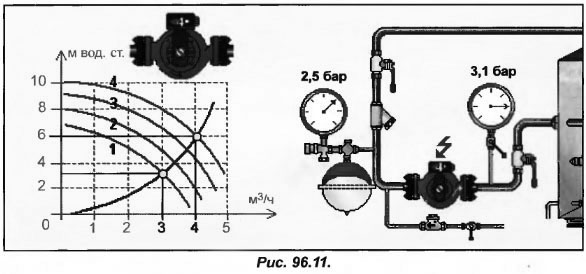 При наличии в установке насоса с регулируемым количеством оборотов, настроить необходимый расход можно путем регулировки числа оборотов с учетом экономии электроэнергии. Так, если нам необходимо понизить расход с 4 м3/ч до 3 м3/ч, то снижаем количество оборотов насоса путем перехода с 4 напорной характеристики к 1 (рис.96.11). Данный способ является достаточно простым и требует от специалиста только умения построить напорную характеристику насоса при разных оборотах. Если напорная характеристика неизвестна, то необходимо действовать поэтапно: определить количество оборотов, а потом расход и так до тех пор, пока не получим необходимый нам показатель расхода.