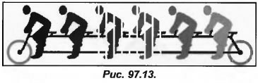 Рассмотрим простой пример, для чего представим 20 велосипедистов, едущих на одном велосипеде (рис.97.13). Попробуем догадаться, смогут ли они достичь скорости 800 км/ч, объединив усилия, с учетом того, что каждый из них едет со скоростью 40 км/ч?