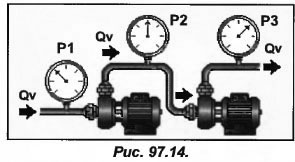 Таким образом, если два насоса установлены последовательно, то расход Qv будет одинаковый как через первый, так и через второй насос. Напор первого повышает давление от Р1 до Р2. Аналогично напор второго будет повышать напор третьего… (рис.97.14).