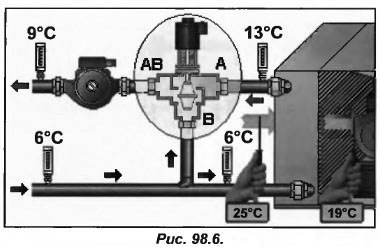 На следующей схеме (рис.98.6) клапан расположен в промежуточном положении. Половина воды с температурой 6 С направляется к патрубку В и АВ, а другая часть следует через воздухоохладитель, отбирая тепло у воздуха и нагреваясь, направляется к патрубку А уже с температурой около 13 С.