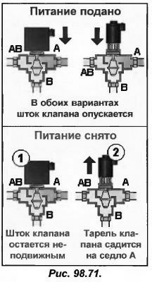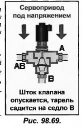 В первую очередь усвоим, что при перекрытии патрубка В напряжение подается на сервопривод (он может быть пневматическим, электромагнитным и др.) с целью заставить шток клапана двигаться и опустить его тарель на седло В (рис.98.69).