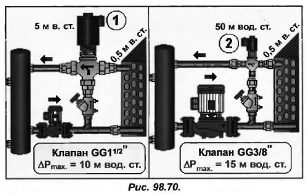 Так на схеме рис.98.70 (поз.2) на клапан VЗV действует разность давлений 50+0,5=50,5 м вод. ст., это при том, что максимальная допустимая разность давлений составляет ΔРmax=15 м вод. ст. По всей видимости на схеме сервопривод не сможет управлять штоком и схема окажется нерабочей.