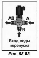 Помимо этого данные трехходовые клапаны одинакового исполнения могут быть наделены функциями смесительных клапанов (к патрубку В подключен вход перепускной магистрали поз.1 рис.98.84) и функциями распределительных клапанов (к патрубку В подсоединен выход перепускной магистрали поз.2 рис.98.84).