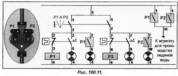 Если для управления схемы с двумя насосами предусмотрен автомат, то проблем, как правило, не возникает. Обычно в схемах предусмотрен трехпозиционный переключатель – пуск Р1, Р2 и остановка. С его помощью мы определяем, какому насосу необходимо работать, а какому — нет (рис.100.11).