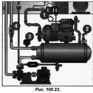 Рассмотрим автоматические средства выключения компрессора с конденсатором воздушного охлаждения при резком росте ВД. В нашем распоряжении имеется три предохранительных средства (рис.100.23):