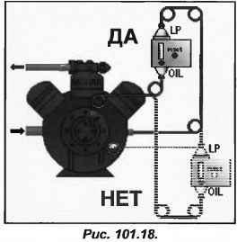 Допустим, производитель компрессора укомплектовал его реле контроля давления масла, это означает, что оно будет действовать по собственным правилам. При самостоятельной установке необходимо учитывать то, что корпус реле не должен находиться ниже уровня масла в картере (101.18), поскольку в противном случае внутрь сильфонов будет попадать различный мусор (флюс, припой, кусочки металла и пр.).
