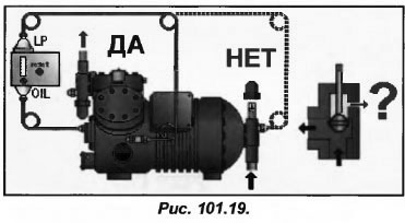 Соединение сильфона LP (НД) необходимо проводить с полостью картера компрессора и не соединять его с технологическим отверстием запорного вентиля всасывания, поскольку он может быть отсечен от всасывающей полости компрессора (рис.101.19).