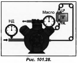 В первую очередь необходимо убедиться, что во время работы компрессора показания манометра НД и давления масла имеют одинаковые значения (рис.101.28). Не следует забывать, что всегда необходимо пользоваться только проверенными манометрами, поскольку в противном случае вы можете сделать неверные выводы. С этой целью положено периодически сдавать манометры на проверку.