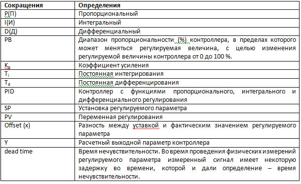 И-контроллер Главным отличием И-контроллера является способность устранять отклонение регулируемой величины согласно уставки. Эта особенность ему присуща благодаря свойству менять выходной сигнал до устранения отклонения. Вместе с этим способность И-контроллера менять отклонение имеет и негативную сторону, поскольку увеличивается тенденция колебаниям регулируемой величины. В И-контроллерах умение нейтрализовать изменение тепловой нагрузки выражено слабее, а тенденция к колебаниям регулируемой величины сильнее, чем в П-контроллерах. ПИ-конгтроллеры Пи-контроллер создавался на основе изученных недостатков П- и И- контроллеров. В них имеется возможность менять параметры РВ и Ti. При изменении параметра Ti следует выбирать между стабильностью процесса и устранением отклонений. Снижение данной величины в свою очередь станет причиной снижения отклонения, при этом повысив склонность к колебаниям регулируемой величины. Д-контроллер Одной из самых важных особенностей Д-контроллера является его способность реагировать на изменение регулируемой величины. Вместе с этим, при появлении постоянного отклонения он не имеет возможности его устранить. Дифференциальная составляющая Д-контроллера стимулирует систему реагировать быстрее на изменение нагрузки, а также повышает устойчивость и реакцию системы. На отклонение это не оказывает какого-либо воздействия, но тенденция к колебаниям снижается. Контроллеры с дифференциальной составляющей быстрее реагируют на изменения тепловой нагрузки, что позволяет им быстрее сглаживать все параметры. В таких контроллерах предоставляется возможность изменять параметр Td. Его можно задавать в секундах или минутах, но не величина данного параметра не должна быть чрезмерно высокой, поскольку его воздействие при изменении уставки будет слишком большим. При запуске установки дифференциальную составляющую лучше исключить (Td=0). На практике для сглаживаний колебаний Д-контроллер не используют самостоятельно, а с ПД- или ПИД-регуляторами. ПИД-контроллеры Самыми большими преимуществами наделен ПИД-контроллер со всеми тремя составляющими, а именно: - интегральная составляющая, позволяющая устранять отклонения (ее повышение быстро снижает отклонение);