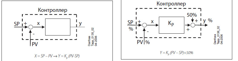 П-контроллер Любой П-контроллер наделен свойствами пропорционального регулятора. В нем предусмотрена линейная зависимость между входными и выходными параметрами. Он спроектирован таким образом, что при условии SP=PV выходной сигнал от контроллера будет равен номинальной тепловой нагрузке на систему, то есть 50% от максимального выходного сигнала. В любом рассматриваемом примере следует учитывать отклонение регулируемой величины – разность SP и PV. С ней П-контроллер справиться не может, поскольку данная погрешность является результатом программирования самого устройства. Основным условием для создания минимального отклонения является то, чтобы регулирующее устройство было чувствительным к отклонениям регулируемой величины, а выходной параметр контроллера обеспечивал снятие средней тепловой нагрузки. При выполнении данного условия отклонение будет минимальным в любой момент, а в скором времени вообще приблизится к нулю. Характеристики П-контроллера Основной характеристикой П-контроллера является его следование пропорциональному закону регулирования. При пропорциональном регулировании создается отклонение, которое может быть незначительным и невероятно большим. Но, не смотря на это, лучше использовать пропорциональное регулирования, чем обходиться без него. Существует два варианта изменения диапазона пропорциональности РВ: - при увеличении РВ произойдет смещение регулируемой величины, а тенденция к колебаниям снизится;