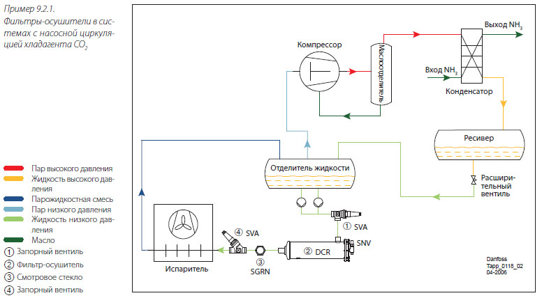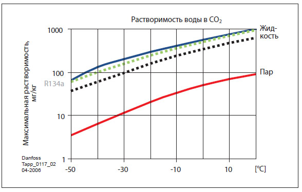 Использование фильтров-осушителей в системах с СО2 В сравнении с другими типами используемых хладагентов диоксид углерода СО2 имеет способность растворять воду, причем при различных фазах воды она существенно отличается. Эта особенность повышает опасность замерзания воды в системе. Когда жидкий СО2 кипит в испарителе, растворимость воды в хладагенте значительно снижается, что является причиной образования воды. Если система в этот момент будет работать при температуре ниже 0 С, то свободная вода превратится в кристаллы льда, что непременно станет причиной поломки оборудования (лед забьет фильтры, соленоидные и регулирующие вентили и прочие элементы). Применение фильтров-осушителей в системах с насосной циркуляцией хладагента СО2 Предусматривая установку фильтра-осушителя в систему, необходимо учитывать следующие факторы: - относительную влажность. При снижении относительной влажности хладагента производительность фильтра-осушителя также снижается;