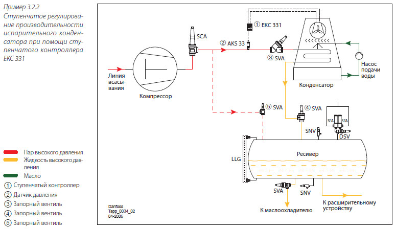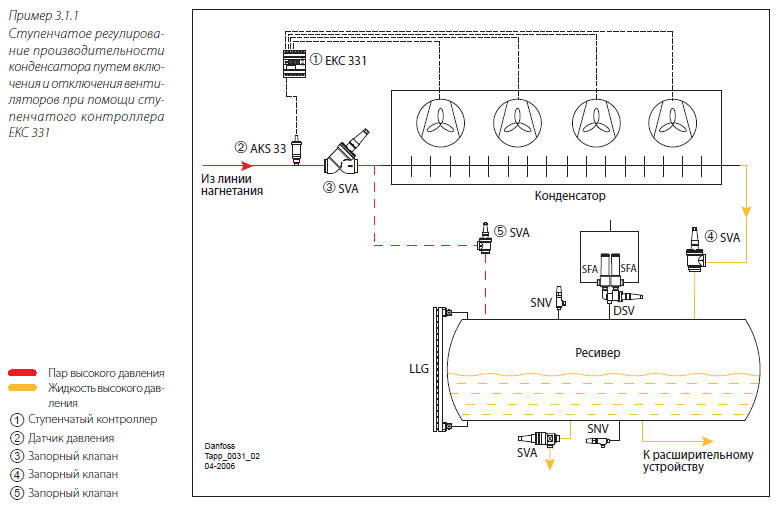 Используемый ступенчатый регулятор ЕКС 331 (1) служит для включения и отключения вентиляторов согласно показаниям датчиков давления AKS 33 (2). Четырехступенчатый регулятор ЕКС 331 с нейтральной зоной способен контролировать работу конденсатора так, чтобы давление конденсации оставалось выше минимально допустимого уровня.