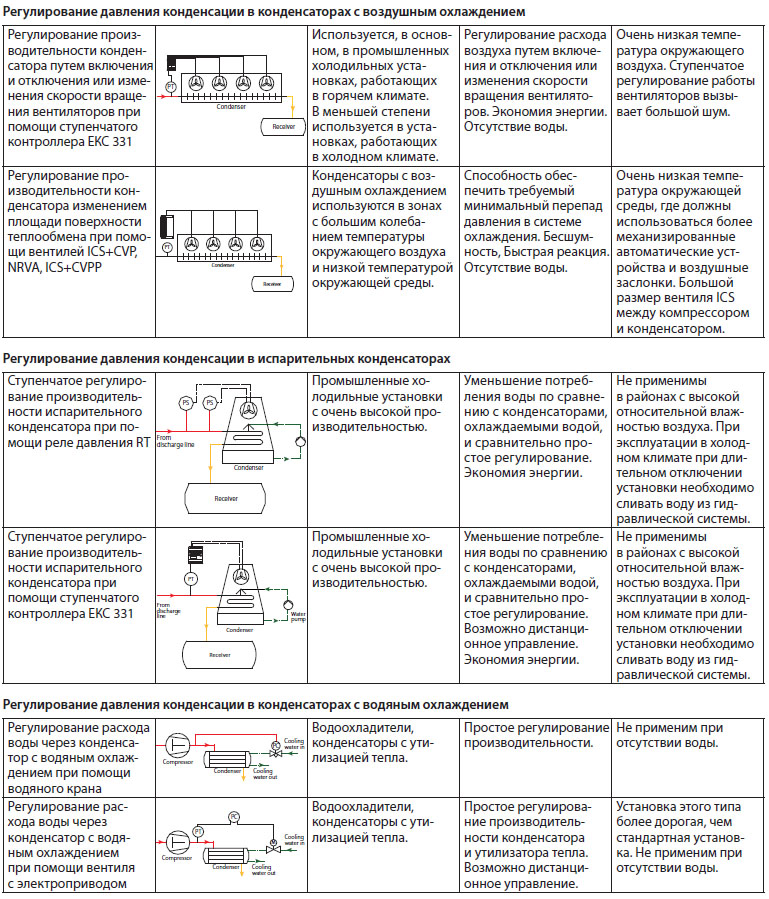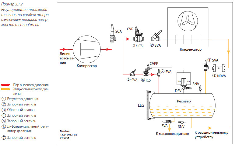 Регулирование площади теплообмена может проводиться следующими способами: - с использованием вентилей ICS (или РМ) вместе с пилотом постоянного давления CVP. Монтируют их на линии горячего газа перед конденсатором. В свою очередь вентили ICV с пилотом перепада давления CVPP монтируют на трубопроводе между ресивером и линией горячего газа. Также на трубопроводе между конденсатором и ресивером устанавливают обратный клапан NRVA. Это необходимо для того чтобы жидкий хладагент из ресивера не поступал в конденсатор;