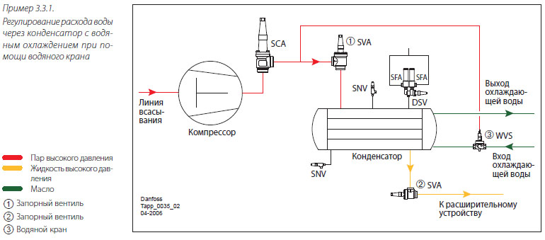 Для регулирования давления конденсации используется управляемый водяной кран (с электроприводом или электронным контроллером). Он позволяет следить за расходом воды относительно давления конденсации. Данный метод позволяет поддерживать давление конденсации на заданном уровне. При регулировании данным способом давление конденсации направляется через капиллярную трубку в верхнюю часть водяного крана WVS (3), меняя при этом степень открытия крана. В то же время водяной кран служит регулятором пропорционального типа.
