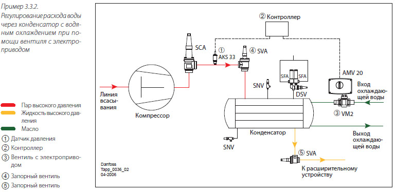От датчика давления AKS 33 (1) контроллер (2) получает результаты и направляет их на привод AMV 20 вентиля VM 2 (3). За расходом охлаждающей воды следит электронный вентиль и поддерживает постоянное давление конденсации.