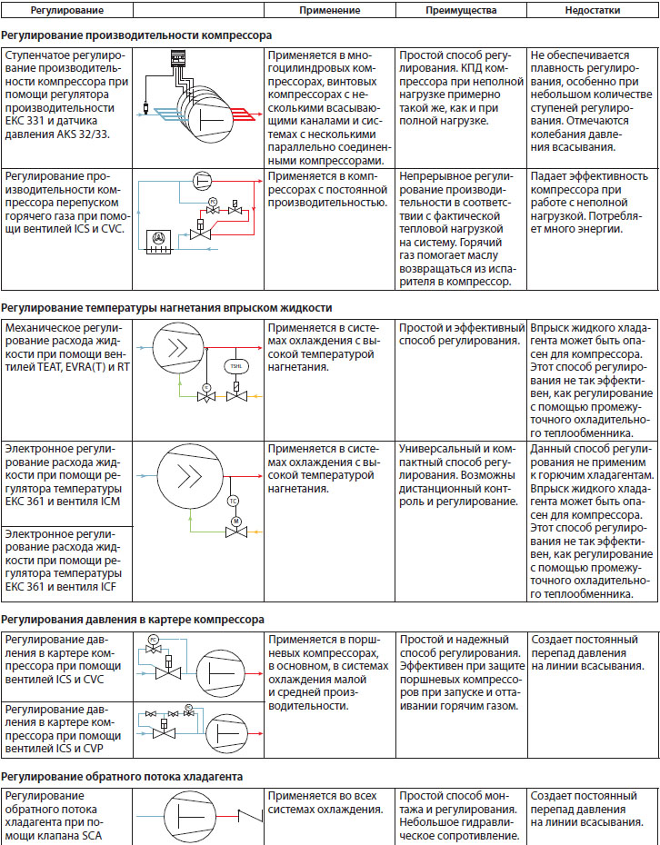 Для любой холодильной установки подбор компрессора осуществляют по производительности, которая должна соответствовать максимальной тепловой нагрузке на систему. Зачастую она ниже номинальной производительности компрессора, поэтому возникает потребность в регулировке его мощности. Известны следующие способы регулирования производительности компрессора: