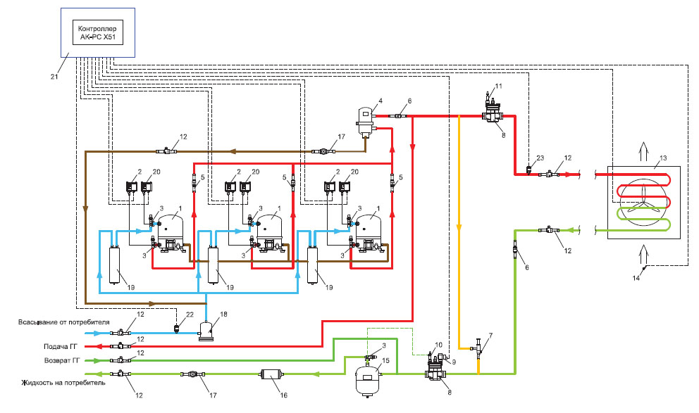 Многокомпрессорная холодильная машина с системой зимнего пуска и регулятором перепада давления для оттайки горячим газом линии слива в ресивер - Компрессор Danfoss