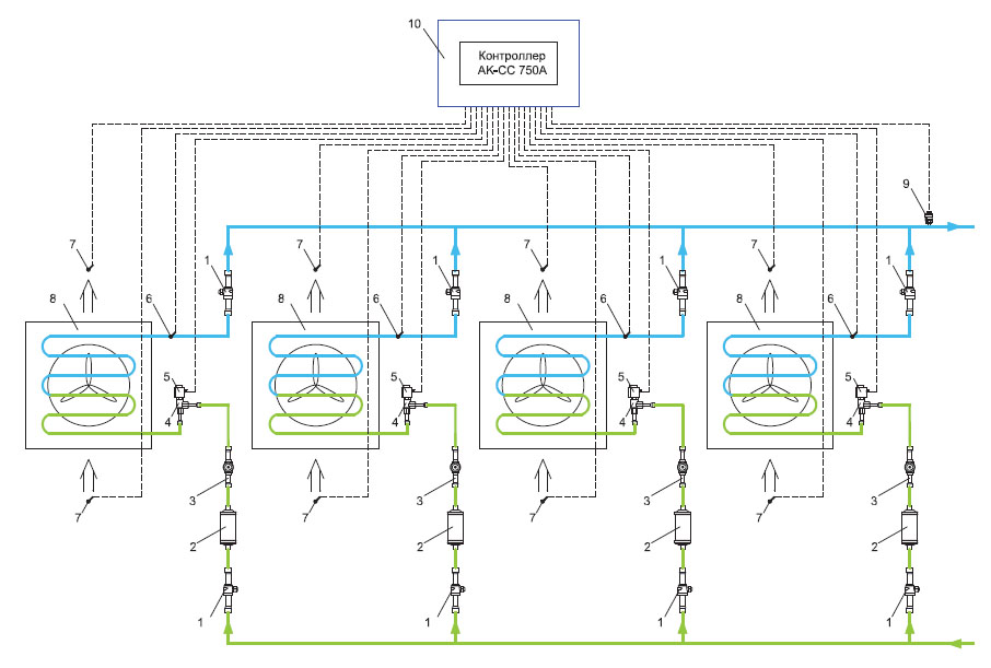 Главная Техническая информация Принципиальные схемы холодильных установок Обвязка четырех воздухоохладителей с электронными РВ