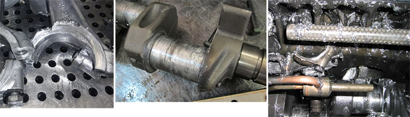 Разрушение при гидроударе - Конструктивные особенности: В других типах компрессоров, где конструкция подвижной спирали и втулки вала эксцентрика не предусматривает возможности расширения спиралей при гидроударе, последствия могут быть гораздо более серьезными.