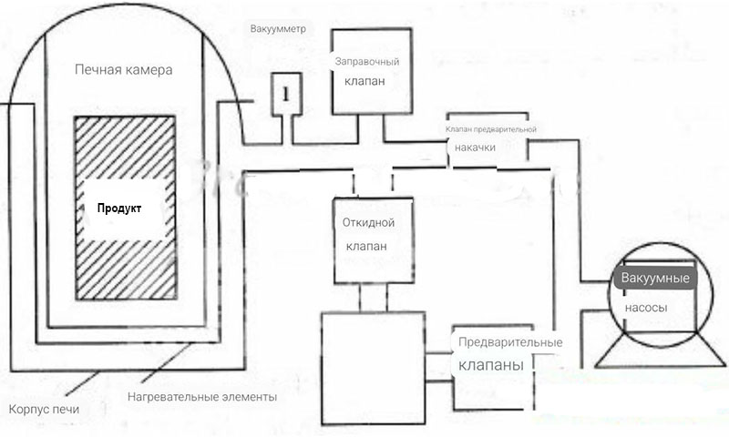 На фото принцип работы вакуумной печи Конструкция вакуумной печи включает в себя несколько ключевых компонентов, каждый из которых играет важную роль в её работе. Рассмотрим эти компоненты подробнее: