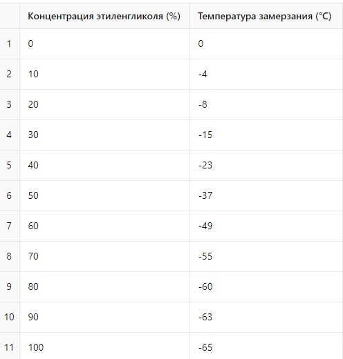 На фото зависимость температуры замерзания пропиленгликоля от температуры На фото зависимость температуры замерзания пропиленгликоля от температуры Этиленгликоль (EG) Этиленгликоль – это бесцветная жидкость с химической формулой C₂H₆O₂. Он является более токсичным, чем пропиленгликоль, и требует осторожного обращения. Применение этиленгликоля: - Автомобильная промышленность: Используется в антифризах и охлаждающих жидкостях для двигателей.