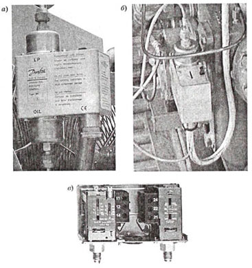 Рис. 1.Реле давления: а — внешний вид (виден сальник); б — реле на агрегате; в — клеммные колодки сдвоенного реле давления (ввод кабеля снизу).