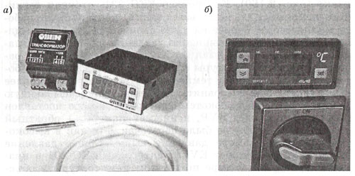Рис. 4Контроллеры: а — контроллер «Овен», трансформатор и датчик температуры; б — контроллер «Eliwell», установленный в дверце щита.