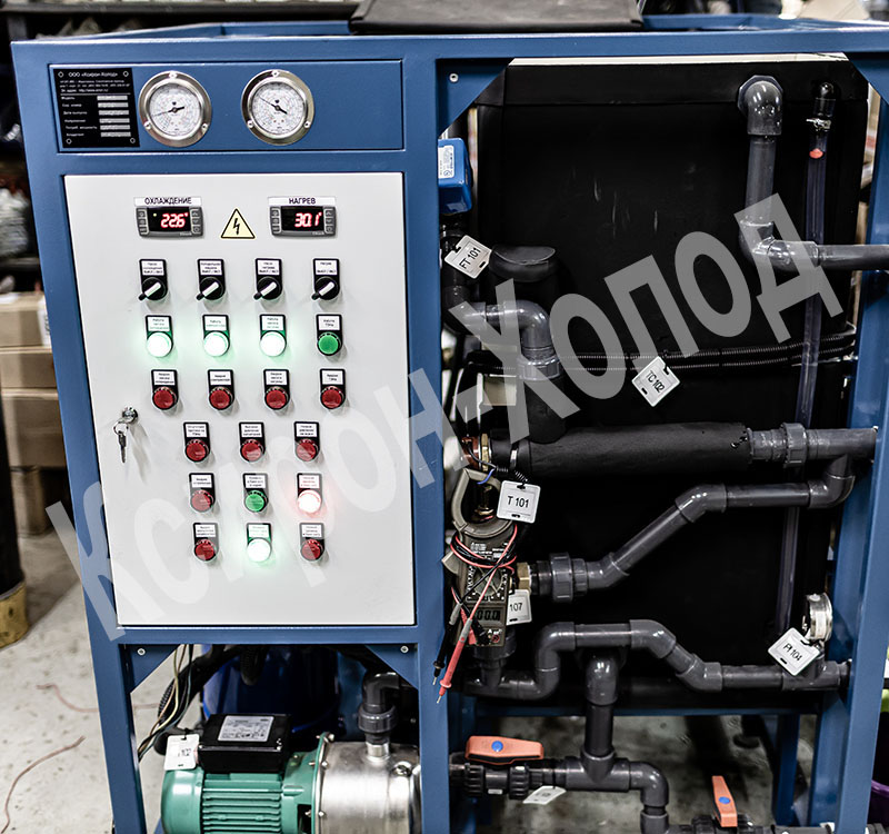 На фото чиллер для охлаждения воды с функцией нагрева Системы автоматического регулирования и защиты, позволяют эксплуатировать чиллер без постоянного присутствия обслуживающего персонала.
