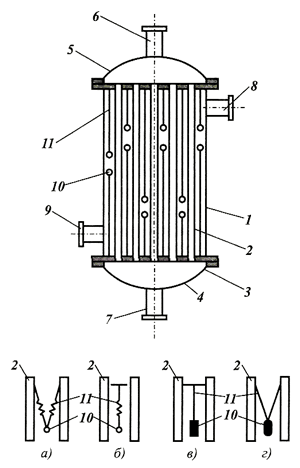 На рис. 3 приведена схема устройства теплообменника, реализующая техническую сущность предложенного решения. Теплообменник состоит из обечайки 1, трубного пучка 2, трубных решеток 3, крышек 4 и 5, штуцеров входа и выхода холодильного агента 6, 7, подводящих и отводящих патрубков влажного воздуха 8 и 9. Кроме того, в межтрубном пространстве пучка между трубными решетками смонтирована очистительная насадка 10, укрепленная на упругих элементах 11. Очистительная насадка 10 выполняется из высокотеплопроводного металла в форме шара, цилиндра или эллипсоида. Упругие элементы 11 представляют собой гибкие стальные спицы разной длины (см. рис. 3). Конструктивно они могут выполняться также в виде пружин (варианты а и б) или подвесных нитей (варианты в и т.д.).